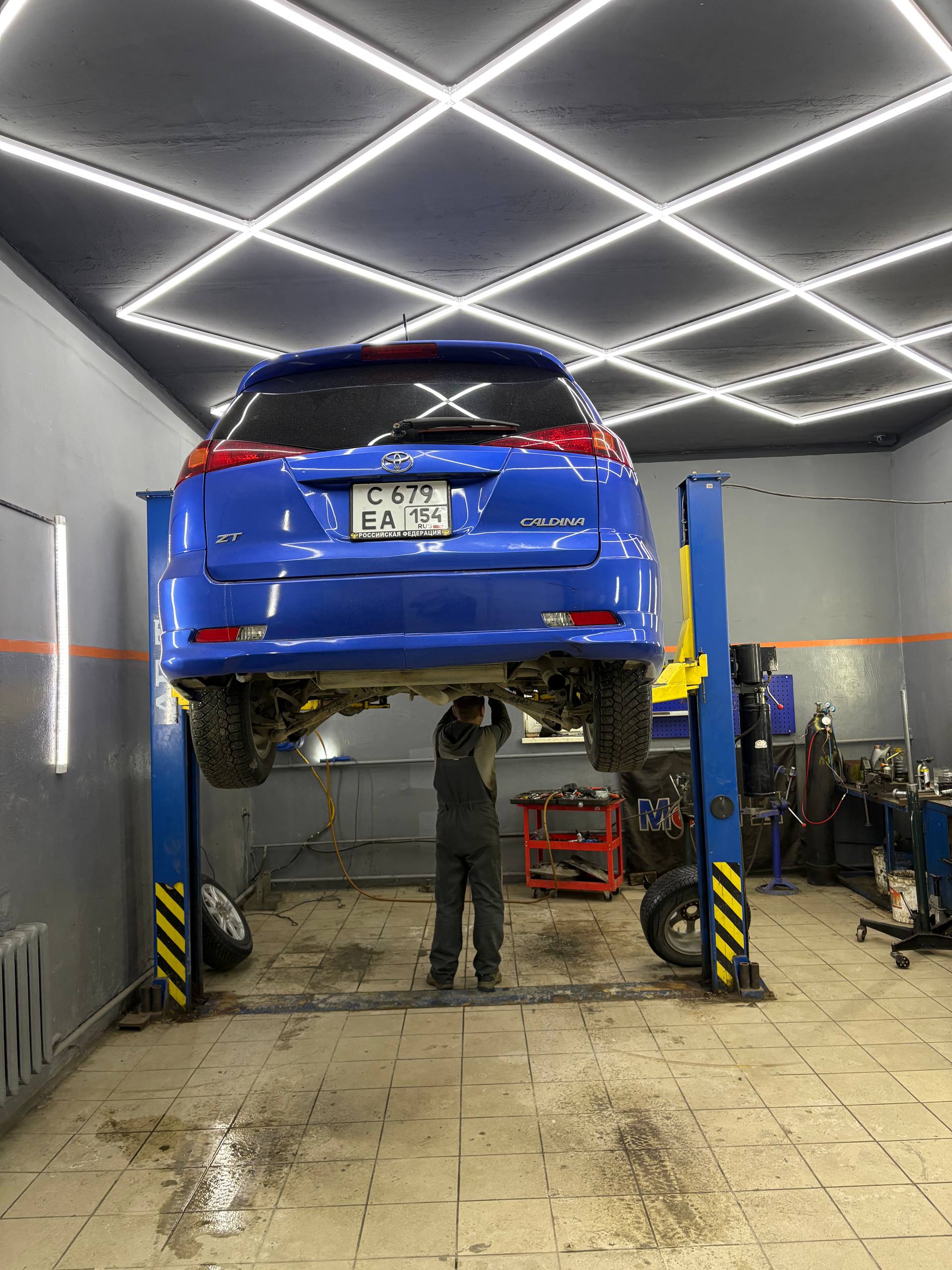 Замена передних стоек и втулок СПУ на Тойоте Caldina синего цвета.